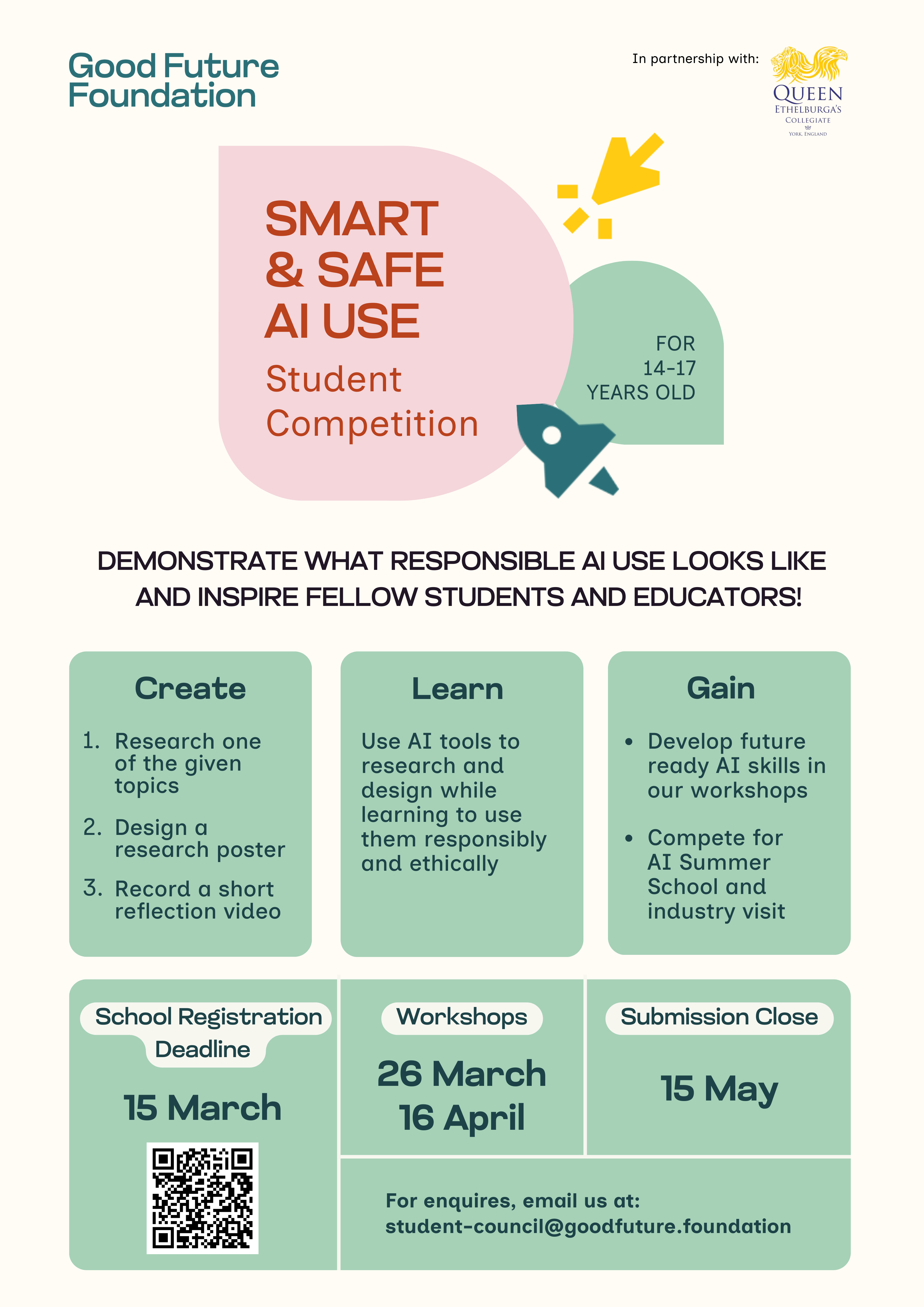 In partnership with Queen Ethelburga's Collegiate, Student Council of Good Future Foundation is organising the Smart and Safe AI Use Student Contest.There is increasing awareness that AI should be used responsibly. However, there is no consensus on what responsible AI use looks like in practice. Through this Student Contest, we aim to encourage students to articulate responsible AI use in practical terms and provide concrete examples for other students to emulate.Participants will: